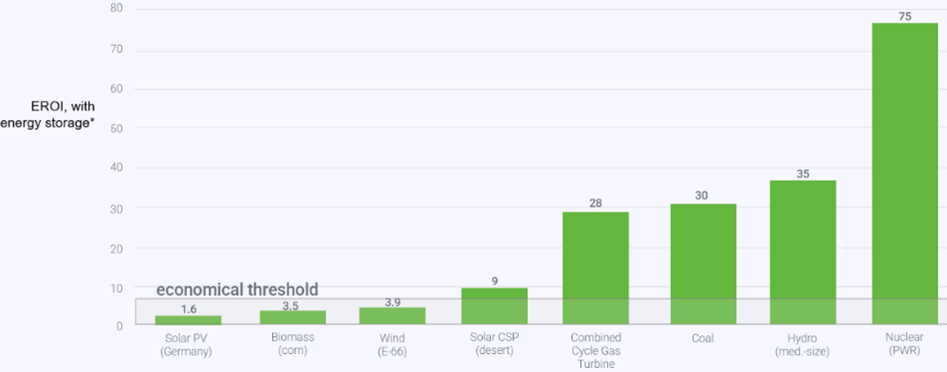 EROI (Energy Return On Investment) is a great measure of energy efficiency; hence why it is important that our political leaders understand it (but many of them don’t). It measures how much energy you get out from an energy source compared to the energy spent extracting, processing and delivering it. An EROI of 8:1 means that you generate eight units of energy for every one unit of energy invested, and 8:1 happens to be the breakeven point; the point where the energy source in question begins to make economic sense.